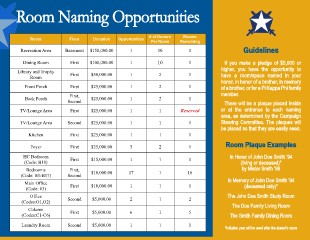 Room Naming Opportunities # of Donors Rooms Room Floor Donation Opportunities Per Room Remaining Recreation Area Basement $150,000.00 1 10 1 Guidelines Dining Room First $100,000.00 1 10 1 If you make a pledge of $5,000 or higher, you have the opportunity to Library and Trophy First $50,000.00 1 2 1 Room have a room/space named in your honor, in honor of a brother, in memory Front Porch First $25,000.00 1 2 1 of a brother, or for a Pi Kappa Phi family First, member. Back Porch $25,000.00 1 2 1 Second There will be a plaque placed inside TV/Lounge Area First $25,000.00 1 1 Reserved or at the entrance to each naming area, as determined by the Campaign TV/Lounge Area Second $25,000.00 1 1 1 Steering Committee. The plaques will be placed so that they are easily seen. Kitchen First $25,000.00 1 1 1 Foyer First $25,000.00 5 2 1 Room Plaque Examples HC Bedroom First $15,000.00 1 1 1 In Honor of John Doe Smith ’94 (Code: B18) (living or deceased)* Bedrooms First, by Mister Smith ‘96 (Code: B1-B17) Second $10,000.00 17 1 16 Main Offce First $10,000.00 1 1 1 In Memory of John Doe Smith ’94 (deceased only)* (Code: 03) Offce 1 The John Doe Smith Study Room (Codes:O1,O2) Second $5,000.00 2 2 The Doe Family Living Room Column (Codes:C1-C6) First $5,000.00 6 1 5 The Smith Family Dining Room Laundry Room Second $5,000.00 1 1 1 *Initiation year will be used after the alumni’s name