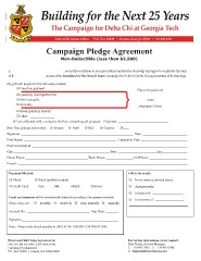 Campaign Pledge Agreement Non-Deductible (less than $2,500) I, ________________________________, accept the invitation to join my brothers and hereby do pledge and agree to contribute the sum of $___________________ as part of the Building For The Next 25 Years Campaign for Delta Chi at the Georgia Institute of Technology. My gift will be paid in the following manner: m One-time payment Plan to be paid over m Quarterly (Jan/Apr/Jul/Oct) } ________________ m Semi-annually years m Annually [Maximum 5 Years] m Stock (publicly traded) m Other: m I am affliated with a company that has a matching gift program. Employer: Start Date (please select one): m January m April m July m October 20 Signature: Date: Print Name: Graduation Year: Preferred Address: City: State: Zip: Home Phone: Work Phone: Cell Phone: E-mail: Payment Method: Gift to be made: m Check m Stock (publicly traded) m In my name as printed above m Credit Card: ____ Visa ____ MC ____ AMEX ____ Discover m Anonymously m In honor of: Credit card payments will be automatically deducted according to the payment schedule. m In memory of: Please select one: m monthly m quarterly m semi-annually m annually Account No.: Exp. Date: Signature: Note: Please make check payable to DELTA CHI HOUSE CORPORATION. Please send this Pledge Agreement to: For further information, please contact: DELTA CHI HOUSE CORPORATION Kyle Taylor, Account Manager Campaign Headquarters T: 770-903-3987 F: 770-903-3988 P.O. Box 80828 | Atlanta, GA 30366-0828 E: ktaylor@thelaurusgroup.net