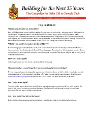 FAQ Continued Will my donation be tax deductible? Due to IRS Tax Laws, we are unable to make all donations tax deductible – only portions of the house that are deemed “educational space” are tax deductible. To ensure we are able to use all donated funds efficiently and effectively we have set a tax deductible threshold. All pledges of $2,500 and greater, made over 5 years, will be tax deductible, to the extent allowable by law, and can be routed through the Delta Chi Educational Foundation for the benefit of Delta Chi at the Georgia Institute of Technology. What if I am unable to make a pledge of $2,500? Donors pledging less than $2,500 over 5 years will make their payments directly to the Delta Chi House Corporation for the Building for the Next 25 Years Campaign. These funds will be deposited into the House Corporation account and used to pay for non-educational portions of the house. All gifts will be recognized in a consistent manner How can I make a gift? Gifts may be made by cash, check , credit/debit card, or stock. My company has a matching gift program; can I apply it to my pledge? If your company has a matching gift program, you will receive donor credit for both your pledge amount and the amount of your company’s matching gift. Please contact our Account Manager, Kyle Taylor at ktaylor@thelaurusgroup.net or by phone at (770) 903-3987 for assistance with this process. Can I make a stock gift? You may utilize appreciated stock to fulfill your campaign pledge commitment. If you wish to make this type of gift, please contact our Account Manager, Kyle Taylor. He will be able to assist you with the procedure for this type of pledge commitment. Can I give an in-kind gift to the house? In-kind gifts will be reviewed and evaluated on a case-by case basis by the Steering Committee.
