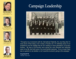 Campaign Leadership Mark Hernandez ’92 Justice Society Donor markhz2000@yahoo.com Paul Picard ’82 Blue & Gold Society Donor paul.picard@yahoo.com Craig Enochs ’94 “Throughout my involvement with the International Fraternity, the only thing that I’m Legacy Society Donor enochscraig@gmail.com more proud of than being a DU is being a Houston DU. I’m extremely proud of our brotherhood and the heritage that we are creating for future generations of Houston brothers. My days at DU-Houston were among the most important and infuential years of my life, and hold some of my most favorite memories. So as a result, there was no question to me whether or not I would be involved in giving to this campaign.” Craig Sowell ’92 Skip Westfall ’95 Friendship Society Donor skip.westfall@gmail.com