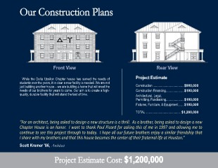 Our Construction Plans Front View Rear View While the Delta Upsilon Chapter house has served the needs of Project Estimate students over the years, it is clear a new facility is needed. We are not just building another house β we are building a home that will meet the Construction ......................................$900,000 needs of our brothers for years to come. Our aim is to create a high- Construction Financing ......................$100,000 quality, durable facility that will stand the test of time. Architectural, Legal, Permitting, Fundraising ......................$100,000 Fixtures, Furniture, & Equipment .......$100,000 TOTAL ........................................... $1,200,000 βFor an architect, being asked to design a new structure is a thrill. As a brother, being asked to design a new Chapter House is an honor. I want to thank Paul Picard for asking this of me in 1997 and allowing me to contnue to see this project through to today. I hope all our future brothers enjoy a similar friendship that I share with my brothers and that this house becomes the center of their fraternal life at Houston.β Scott Kremer β86, Architect Project Estimate Cost: $1,200,000