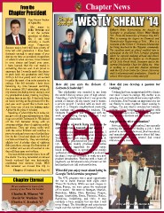 From the Chapter News Chapter President Dear Alumni Brother Chapter WesTly sheAly ’14 of Alpha Nu, Spotlight My name is John Verrone and Editor’s Note: Representing the chapter as I am the current Spotlight is graduating Senior West Shealy president of Alpha ’14. From the hometown of Kansas City, MO, Nu. I am now West is earning his degree in Chemical and offcially a fourth Biomolecular Engineering at Tech. West is a year Computer recipient of the Robert C. Goizueta Scholarship Science major, but I still have plenty of for being involved in the Hispanic community. time left until graduation. I have been His excellent work at school enabled him to fortunate enough to meet many of you participate in the GA Tech Lorraine program during my time as president. Regardless where he enjoyed studying abroad and travel. of where or when we met, I have listened West has served the chapter as Co-Treasurer to your stories and heard your cries. of GA Tech Greek Week, Treasurer and is the I have learned that the real world is current Scholarship Chair for Alpha Nu. West something that can wait. I am proud to is working as a part-time Student Assistant announce that I recently made the choice with the GA Tech Center for Career Discovery to push back my graduation until May and Development until graduation. Outside of 2016 (a full fve years) and I am excited school, West enjoys cooking and golf. to make the most of an extra semester in college. This fall semester I have been How did you earn the Roberto C. How did you develop a passion for balancing my time between searching Goizueta Scholarship? cooking? for a summer 2015 internship, acing all my classes (including senior design), and This scholarship was awarded to me from Cooking has been an important hobby of mine my presidential duties, making it a pretty the work I did my senior year of high school. ever since I came to college. My mother is an exciting time in my life. It has truly been Attending a Catholic high school, I was given the amazing cook and made dinner every night while an honor serving as the president for the month of January off my senior year to pursue I was home. Food became an important way for past year and I would like to thank each a service project. I worked with an inner city our family to come together. Since coming to and every one of you for helping make school in a Hispanic neighborhood mentoring college, I’ve just tried to emulate her fantastic Alpha Nu the place it is today. the students and assisting the teachers. The cooking. I love bringing people together with Speaking of what Alpha Nu is today, let Goizueta Foundation was impressed with my food and sharing a nice meal. It’s an important me give you all some information on what work upon entering Georgia Tech and I was way for me to de-stress and be creative. is up over at 840 Techwood Dr. We kicked awarded the scholarship. Any plans for after graduation? off the Fall Semester strong with an ΘΧ awesome pledge class of eighteen quality What type of work have you done to Set to graduate this December, I am currently gentlemen. They get along really well earn experience towards your degree? running the gauntlet of fnding a job. I have with the active brothers and continue to As a Chemical and Biomolecular Engineer, I spoken to numerous chemical, pharmaceutical, prove to each and every one of us that they was involved in the Co-op program at Georgia and manufacturing companies about full time live by the Creed and ideals set forth by Tech. I worked three semesters at Johnson & opportunities and have several 2nd round our beloved fraternity. They are relatively Johnson in a pharmaceutical plant in Athens, interviews this October. athletic too! A pledge class of eighteen GA. Our site mainly produced the active falls just above average for fraternities of pharmaceutical ingredient for J&J’s opiate our caliber and we are all excited to one based drugs. I was in operations and mainly day call these men our brothers. worked on the day to day issues that evolved in Our socials this semester have been off the plant. I was also fortunate to work on a new the charts. You may remember an annual product introduction. Working with a team of beach weekend that was historically engineers, we introduced a new process our lab conducted over summer break. Well had fnalized into full scale production. this semester we moved that trip to Chapter (Continued on Page 4) What did you enjoy most about being in Georgia Tech Lorraine program? The GTL program was a great opportunity Chapter eternal for me to travel Europe with eight other Theta Chi brothers. While we took classes in We are saddened to learn of the Metz, France, we were given the weekends passing of our Theta Chi brother: off to travel. We went to Stuttgart, Munich, Charles R. Minors ’45 Barcelona, Milan, Nice, Epernay, Prague, David W. Watkins ’65 Bruges, Amsterdam, Rome, Florence, Venice, Pamplona, Heidelberg, and Oslo. It was Charles F. Jerabek ’67 certainly a busy summer but one that I will never forget. The friendships and experiences Westly with fellow Alpha Nu Dylan Kiess. made over the summer I still treasure today.