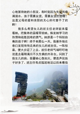 心地第待她的小朋友。有时竞因为失望而噙 满泪水。孩子需要友谊,需要友谊的温暖! 这是父母的爱和亲朋的关心所代替不了的 啊! 我多么希望女儿的班主任老师能来看 看她,把集体的温暖带给她,焕发她学习的 热情和战胜因难的勇气,她原是一个特别自 尊的孩子啊!终于有那么一天,我意外地在 巷口发现匆匆走来的女儿的班主任,一阵惊 喜,便大步迎了上去。班任老师气喘吁吁地 说是去看刚满月不久生病的外孙女,问到了 我女儿的病。我番她心急如火,便连声说孩 子好多了。班主任有点尴尬地说以后来看我