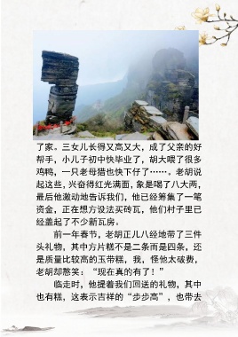 了家。三女儿长得又高又大,成了父亲的好 帮手,小儿子初中快毕业了,胡大喂了很多 鸡鸭,一只老母猎也快下仔了……。老胡说 起这些,兴奋得红光满面,象是喝了八大两, 最后他激动地告诉我们,他已经筹集了一笔 资金,正在想方设法买砖瓦,他们村子里已 经盖起了不少新瓦房。 前一年春节,老胡正儿八经地带了三件 头礼物,其中方片糕不是二条而是四条,还 是质量比较高的玉带糕,我,怪他太破费, 老胡却憨笑:“现在真的有了!” 临走时,他提着我们回送的礼物,其中 也有糕,这表示吉祥的“步步高”,也带去