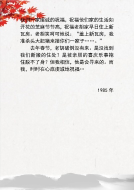我们一家虔诚的祝福,祝福他们家的生活如 开花的芝麻节节高,祝福老胡家早日住上新 瓦房。老胡笑呵可地说:“盖上新瓦房,我 准杀头大肥猪来接你们一家子……。” 去年春节,老胡破例没有来。是没找到 我们新搬的住处?是被亲朋的喜庆乐事拖 住脱不了身?但我相信,他是会寻来的。而 我,时时在心底虔诚地祝福… 1985 年