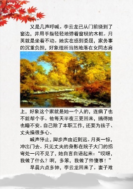 …… 又是几声呼喊。李云龙已从门前绕到了 窗边,并用手指轻轻地弹着窗棂的木框。月 英就是坐着不动。她实在感到委屈,家务事 的沉重负担,好象理所当然地落在女同志肩 上,好象这个家就是她一个人的,连病了也 不能帮个手。他每天半夜三更回来,搞得她 也睡不安。自己除了本职工作,还要为孩子、 丈夫操很多心。 喊声停止,脚步声由近到远。月英一惊, 冲出门去。只见丈夫的身影在院子大门的拐 弯处一闪不见了,她自言自语起来:“哎呀, 我做了什么?啊,多笨,我做了件傻事!” 早晨六点多钟,李云龙回来了。妻子难
