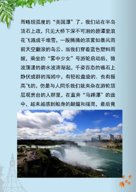 而略现弧度的“美国瀑”了。我们站在半岛 顶石上政,只见大桥下深不可测的碧潭里浪 花飞溅成千堆雪,一股腾腾的浓雾如暴风雨 前天空翻滚的乌云。当我们穿着蓝色塑料雨 披,乘坐的“雾中少女”号游轮启动后,微 波荡漾的碧水波涛渐起,千姿百态的礁石上 静伏成群的海鸥中,有轻松盘旋的.也有振 高飞的,仿是与人同乐我们就夹杂在游轮顶 层观赏台的人群里,在直奔“马蹄瀑”的途 中,越来越感到船身的颠簸和摇晃,最后竟