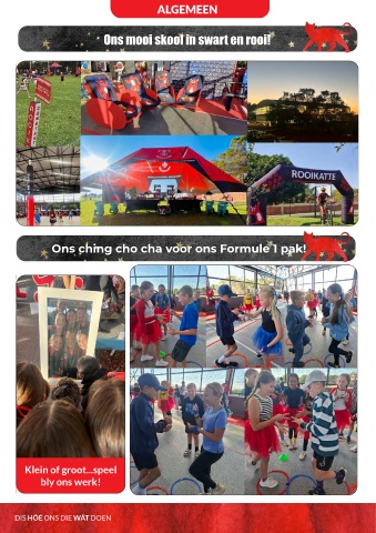 ALGEMEEN Ons mooi skool in swart en rooi! Ons ching cho cha voor ons Formule 1 pak! Klein of groot...speel bly ons werk! DIS HÓÉ ONS DIE WÁT DOEN
