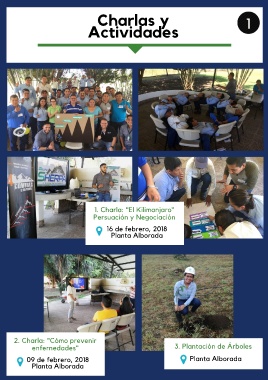Charlas y 1 Actividades 1. Charla: "El Kilimanjaro" Persuación y Negociación 16 de febrero, 2018 Planta Alborada 2. Charla: "Cómo prevenir enfernedades" 3. Plantación de Árboles 09 de febrero, 2018 Planta Alborada Planta Alborada