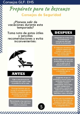 Consejos GLF: EHS Prepárate para tu descanso Consejos de Seguridad ¿Planeas salir de vacaciones durante esta temporada? Toma nota de estas útiles y sencillas recomendaciones y evita inconvenientes: 5