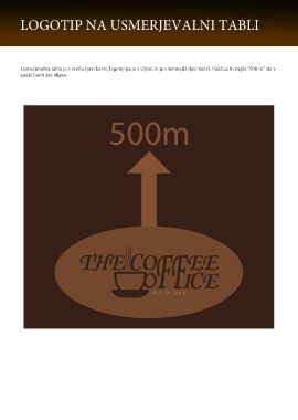 LOGOTIP NA USMERJEVALNI TABLI Usmerjevalna tabla je v svetlo rjavi barvi, logotip pa je v elipsi, ki je v temnejši rjavi barvi. Puščica in napis “500 m” sta v enaki barvi kot elipsa. 500m