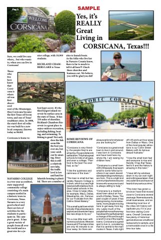 “Corsicana is a medium sized town about an hour southofDallas,Texas.The past couple of years it has been growing, more restau- rants, more people moving here to get away from big city. Lately much of the peoplethatmovedheremay havebeenthosethatwanted a change of life and bought a ranch in one of the nearby towns. Corsicana is a great spot to live in, considering that it is central to the main routes in Texas. It sits right