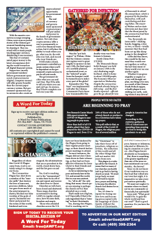 Regardless of where this Covid-19 Plague came from, God is cer- tainly using it to change our focus.