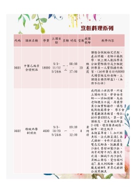 代碼 課程名稱 學費 星期 時段 堂數 教學內容