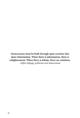 Democracies must be built through open societies that share information. When there is information, there is enlightenment. When there is debate, there are solutions. -Atifete Jahjaga, politician and stateswoman 88