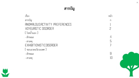 ก สารบัญ เรื่อง หน้า สารบัญ ก โรคถ ้ามอง - ลักษณะ - สาเหตุ ชอบอวดอวัยวะเพศ - ลักษณะ - สาเหตุ
