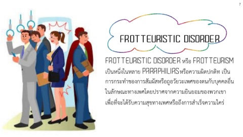 7 หรือ เป็นหนึ่งในหลาย หรือความผิดปกติท เป็น การกระท าของการสัมผัสหรือถูอวัยวะเพศของตนกับบุคคลอื่น ในลักษณะทางเพศโดยปราศจากความยินยอมของพวกเขา เพื่อที่จะได้รับความสุขทางเพศหรือถึงการส าเร็จความใคร่