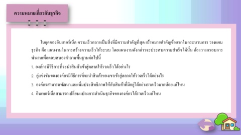 ธุรกิจ คือ แผนงานในการสร้างความเร็วให้ระบบ โดยแผนงานดังกล่าวจะประสบความสําเร็จได้นั้น ต้องวางกรอบการ