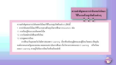 1. การนําอินเทอร์เน็ตมาใช้ในงานทางด้านธุรกิจการศึกษา (Education) เช่น