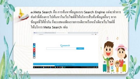 3.Meta Search คือ การค้นหาข้อมูลแบบ Search Engine แต่จะท าการ ส่งค าที่ต้องการไปค้นหาในเว็บไซต์ที่ให้บริการสืบค้นข้อมูลอื่นๆ หาก ข้อมูลที่ได้ซ ากัน ก็จะแสดงเพียงรายการเดียวหรือหน้าเดียวเว็บไซต์ที่ ้ ให้บริการ Meta Search เช่น