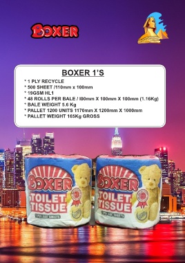 BOXER 1’S * 1 PLY RECYCLE * 500 SHEET /110mm x 100mm * 19GSM HL1 * 48 ROLLS PER BALE / I00mm X 100mm X 100mm (1.16Kg) * BALE WEIGHT 5.6 Kg * PALLET 1200 UNITS 1170mm X 1200mm X 1000mm * PALLET WEIGHT 165Kg GROSS
