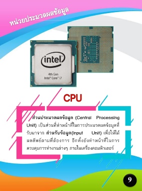 ส่วนประมวลผลข้อมูล (Central Processing Unit) เป็นส่วนที่ท าหน้าที่ในการประมวลผลข้อมูลที่ รับมาจาก ส่วนรับข้อมูล(Input Unit) เพื่อให้ได้ ผลลัพธ์ตามที่ต้องการ อีกทั้งยังท าหน้าที่ในการ ควบคุมการท างานต่างๆ ภายในเครื่องคอมพิวเตอร์ 9