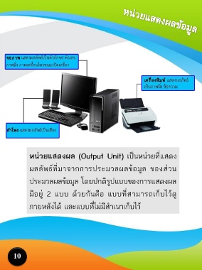 หน่วยแสดงผล (Output Unit) เป็นหน่วยที่แสดง ผลลัพธ์ที่มาจากการประมวลผลข้อมูล ของส่วน ประมวลผลข้อมูล โดยปกติรูปแบบของการแสดงผล มีอยู่ 2 แบบ ด้วยกันคือ แบบที่สามารถเก็บไว้ดู ภายหลังได้ และแบบที่ไม่มีส าเนาเก็บไว้ 10