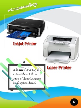 เครื่องพิมพ์ (Printer) เป็น ฮาร์ดแวร์ที่ท าหน้าที่ในหน่วย แสดงผล ใช้ส าหรับแสดงผล ข้อมูลในรูปแบบสิ่งพิมพ์ 13