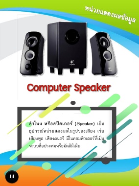 ล าโพง หรือสปีคเกอร์ (Speaker) เป็น อุปกรณ์หน่วยสดงผลในรูปของเสียง เช่น เสียงพูด เสียงดนตรี มีในคอมพิวเตอร์ที่เป็น ระบบสื่อประสมหรือมัลติมีเดีย 14