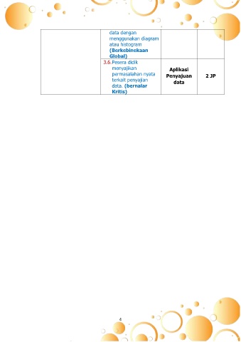data dengan menggunakan diagram atau histogram (Berkebinekaan Global) 3.6. Pesera didik menyajikan Aplikasi permasalahan nyata Penyajuan 2 JP terkait penyajian data data. (bernalar Kritis) 4
