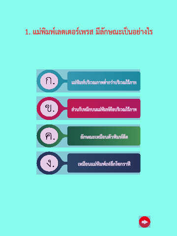 1. แม่พิมพ์เลตเตอร์เพรส มีลักษณะเป็นอย่างไร แม่พิมพ์บริเวณภาพต�่ากว่าบริเวณไร้ภาพ ส่วนรับหมึกบนแม่พิมพ์คือบริเวณไร้ภาพ ลักษณะเหมือนตัวพิมพ์ดีด เหมือนแม่พิมพ์เฟล็กโซกราฟี