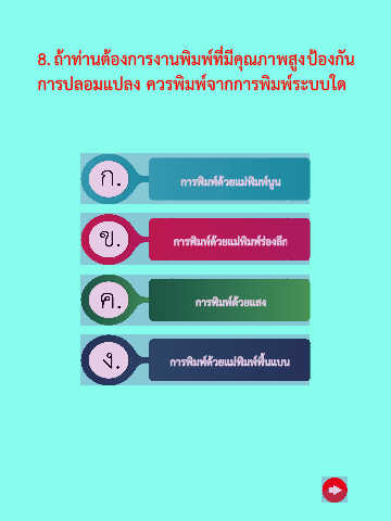 8. ถ้าท่านต้องการงานพิมพ์ที่มีคุณภาพสูง ป้องกัน การปลอมแปลง ควรพิมพ์จากการพิมพ์ระบบใด การพิมพ์ด้วยแม่พิมพ์นูน การพิมพ์ด้วยแม่พิมพ์ร่องลึก การพิมพ์ด้วยแสง การพิมพ์ด้วยแม่พิมพ์พื้นแบน