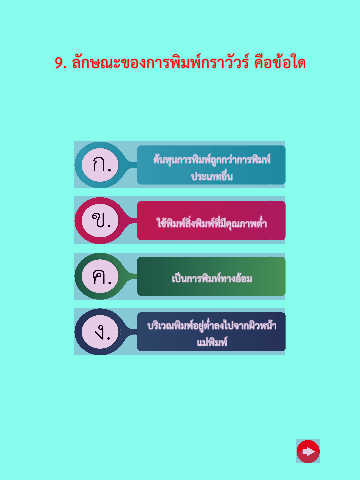 9. ลักษณะของการพิมพ์กราวัวร์ คือข้อใด ต้นทุนการพิมพ์ถูกกว่าการพิมพ์ ประเภทอื่น ใช้พิมพ์สิ่งพิมพ์ที่มีคุณภาพต�่า เป็นการพิมพ์ทางอ้อม บริเวณพิมพ์อยู่ต�่ำลงไปจำกผิวหน้ำ แม่พิมพ์