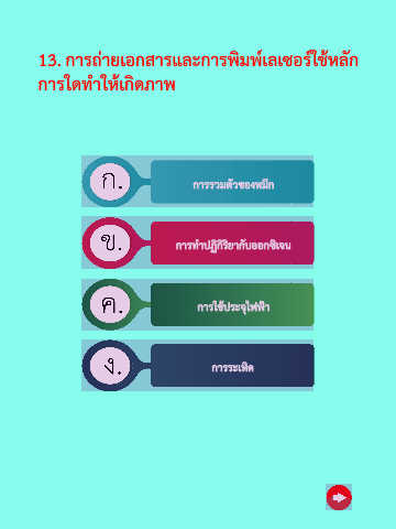 13. การถ่ายเอกสารและการพิมพ์เลเซอร์ใช้หลัก การใดท�าให้เกิดภาพ การรวมตัวของหมึก การท�าปฏิกิริยากับออกซิเจน การใช้ประจุไฟฟ้า การระเหิด