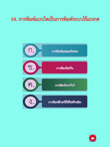 14. การพิมพ์แบบใดเป็นการพิมพ์ระบบไร้แรงกด การพิมพ์เลตเตอร์เพรส การพิมพ์สกรีน การพิมพ์กราวัวร์ การพิมพ์ด้วยวิธีใช้ไฟฟ้าสถิต