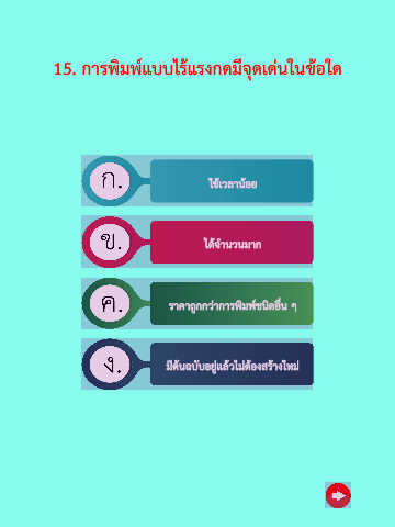 15. การพิมพ์แบบไร้แรงกดมีจุดเด่นในข้อใด ใช้เวลาน้อย ได้จ�ำนวนมำก ราคาถูกกว่าการพิมพ์ชนิดอื่น ๆ มีต้นฉบับอยู่แล้วไม่ต้องสร้างใหม่