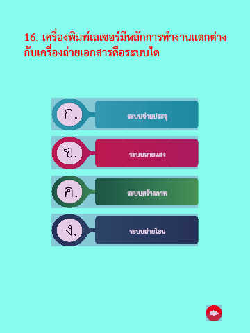 16. เครื่องพิมพ์เลเซอร์มีหลักการท�างานแตกต่าง กับเครื่องถ่ายเอกสารคือระบบใด ระบบจ่ายประจุ ระบบฉายแสง ระบบสร้างภาพ ระบบถ่ายโอน