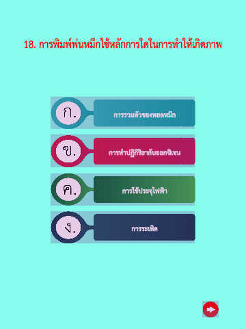 18. การพิมพ์พ่นหมึกใช้หลักการใดในการท�าให้เกิดภาพ การรวมตัวของหยดหมึก การท�าปฏิกิริยากับออกซิเจน การใช้ประจุไฟฟ้า การระเหิด