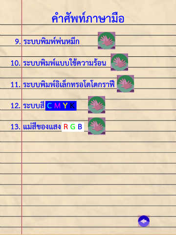 ค�ำศัพท์ภำษำมือ 9. ระบบพิมพ์พ่นหมึก 10. ระบบพิมพ์แบบใช้ควำมร้อน 11. ระบบพิมพ์อิเล็กทรอโตโตกรำฟี 12. ระบบสี C M Y K 13. แม่สีของแสง R G B