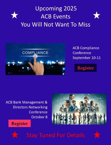 Upcoming 2025 ACB Events You Will Not Want To Miss ACB Compliance Conference September 10-11 Register ACB Bank Management & Directors Networking Conference October 8 Register Stay Tuned For Details