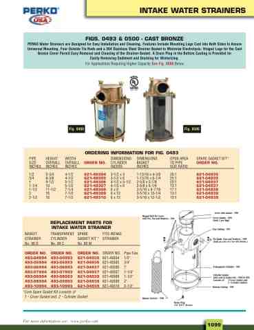 PERKO Water Strainers are Designed for Easy Installation and Cleaning. Features Include Mounting Lugs Cast into Both Sides to Assure Universal Mounting, Four Outside Tie Rods and a 304 Stainless Steel Strainer Basket to Minimize Electrolysis. Hinged Lugs for the Cast Bronze Cover Permit Easy Removal and Cleaning of the Strainer Basket. A Drain Plug in the Bottom Casting is Provided for Easily Removing Sediment and Draining for Winterizing. For Applications Requiring Higher Capacity See Fig. 0500 Below