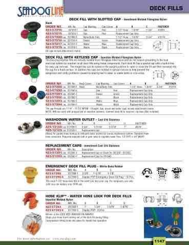 DECK FILL WITH KEYLESS CAP - Injection Molded Fibreglass Nylon The Sea-Dog Keyless Fills are entirely molded from fibreglass filled nylon and do not require grounding to the boat electrical system as required on all deck fills using metal components. Each deck fill has a special cap with a built-in key for easy cap removal. The hinged key can be locked in the upright position to open or close the fill and then recessed into the cap for a flush surface. In addition the caps are molded in special colours to help prevent the dangerous and costly problems caused by placing fuel in water or waste tanks or vice-versa.