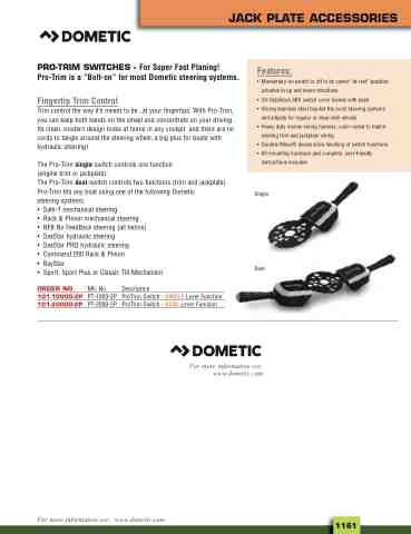The Pro-Trim single-switch controls one function (engine trim or jackplate). The Pro-Trim dual-switch controls two functions (trim and jackplate). Pro-Trim fits any boat using one of the following Dometic steering systems. • Safe-T mechanical steering • Rack & Pinion mechanical steering • NFB No FeedBack steering (all helms) • SeaStar hydraulic steering • SeaStar PRO hydraulic steering • Command 200 Rack & Pinion • BayStar • Sport, Sport Plus or Classic Tilt Mechanism