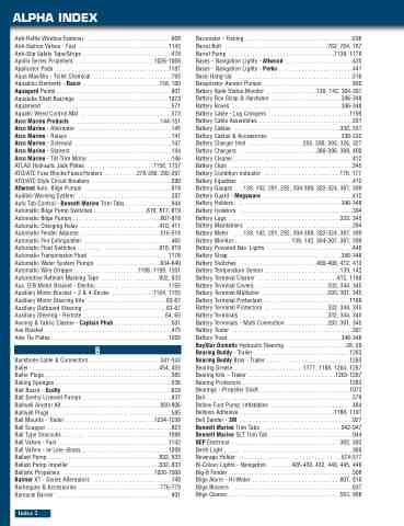 Barometer - Fishing . . . . . . . . . . . . . . . . . . . . . . . . . . . . . . . . . . .636 Barrel Bolt . . . . . . . . . . . . . . . . . . . . . . . . . . . . . . . . . .762, 764, 767 Barrel Pump . . . . . . . . . . . . . . . . . . . . . . . . . . . . . . . . . . .1139, 1178 Bases - Navigation Lights - Attwood . . . . . . . . . . . . . . . . . . . . . .435 Bases - Navigation Lights - Perko . . ... . . . . . . . . . . . . . . . . . . .441 Basic Hang-Up . . . . . . . . . . . . . . . . ... . . . . . . . . . . . . . . . . . . .516 Basspirator Aerator Pumps . . . . . . . ... . . . . . . . . . . . . . . . . . . .800 Battery Bank Status Monitor . . . . . . . . . . . . . . . . .139, 142, 304-307 Battery Box Strap & Hardware . . . . . . . . . . . . . . . . . . . . . . .346-348 Battery Boxes . . . . . . . . . . . . . . . . . . . . . . . . . . . . . . . . . . . .346-348 Battery Cable - Lug Crimpers .... . ... . . . . . . . . . . . . . . . . . .1199 Battery Cable Assemblies . . . ..... . ... . . . . . . . . . . . . . . . . . . .331 Battery Cables . . . . . . . . . . . . . . . . . . . . . . . . . . . . . . . . . . .330, 331 Battery Cables & Accessories . ........ . . . . . . . . . . . . . . .330-332 Battery Charger Inlet . . . . . . . . . . . . . . . . . .255, 390, 393, 326, 327 Battery Chargers . . . . . . . . . . . . . . . . . . . . . . . . .386-396, 398, 400 Battery Cleaner . . . . . . . . . . . . . . . . . . . . . . . . . . . . . . . . . . . . . .412 Battery Clips . . . . . . . . . . . . . . . . . . . . . . . . . . . . . . . . . . . . . . . . .345 Battery Condition Indicator . . . . . . . . . . . . . . . . . . . . . . . . .176, 177 Battery Equaliser . . . . . . . . . . . . . . . . . . . . . . . . . . . . . . . . . . . . .412 Battery Gauges . . .139, 142, 291, 292, 304-308, 322-324, 397, 399 Battery Guard - Megaware . . . . . . . . . . . . . . . . . . . . . . . . . . . . . .412 Battery Holders . . . . . . . . . . . . . . . . . . . . . . . . . . . . . . . . . .346-348 Battery Isolators . . . . . . . . . . . . . . . . . . . . . . . . . . . . . . . . . . . . .394 Battery Lugs . . . . . . . . . . . . . . . . . . . . . . . . . . . . . . . . . . . . .332, 345 Battery Maintainers . . . . . . . . . . . . . . . . . . . . . . . . . . . . . . . . . . .394 Battery Meter . . . .139, 142, 291, 292, 304-308, 322-324, 397, 399 Battery Monitor . . . . . . . . . . . . . . . . . . .139, 142, 304-307, 397, 399 Battery Powered Nav. Lights . . . . . . . . . . . . . . . . . . . . . . . . . . . .446 Battery Strap . . . . . . . . . . . . . . . . . . . . . . . . . . . . . . . . . . . . .346-348 Battery Switches . . . . . . . . . . . . . . . . . . . . . . . . . .400-408, 412, 413 Battery Temperature Sensor . . . . . . . . . . . . . . . . . . . . . . . . .139, 142 Battery Terminal Cleaner . . . . . . . . . . . . . . . . . . . . . . . . . .412, 1188 Battery Terminal Covers . . . . . . . . . . . . . . . . . . . . . . .332, 344, 345 Battery Terminal Multiplier . . . . . . . . . . . . . . . . . . . . . .293, 301, 345 Battery Terminal Protectant . . . . . . . . . . . . . . . . . . . . . . . . . . . .1188 Battery Terminal Protectors . . . . . . . . . . . . . . . . . . . . .332, 344, 345 Battery Terminals . . . . . . . . . . . . . . . . . . . . . . . . . . . .332, 344, 345 Battery Terminals - Multi Connection . . . . . . . . . . . . . .293, 301, 345 Battery Tester . . . . . . . . . . . . . . . . . . . . . . . . . . . . . . . . . . . . . . . .397 Battery Trays . . . . . . . . . . . . . . . . . . . . . . . . . . . . . . . . . . . . .346-348 BayStar Dometic Hydraulic Steering . . . . . . . . . . . . . . . . . . . .28, 29 Bearing Buddy - Trailer . . . . . . . . . . . . . . . . . . . . . . . . . . . . . . .1263 Bearing Buddy Bras - Trailer . . . . . . . . . . . . . . . . . . . . . . . . . .1263 Bearing Grease . . . . . . . . . . . . . . . . . . . . . . .1177, 1188, 1264, 1267 Bearing Kits – Trailer . . . . . . . . . . . . . . . . . . . . . . . . . . . . .1263-1267 Bearing Protectors . . . . . . . . . . . . . . . . . . . . . . . . . . . . . . . . . . .1263 Bearings - Propeller Shaft . . . . . . . . . . . . . . . . . . . . . . . . . . . . .1073 Bell . . . . . . . . . . . . . . . . . . . . . . . . . . . . . . . . . . . . . . . . . . . . . . . .579 Bellow Foot Pump, Inflatables . . . . . . . . . . . . . . . . . . . . . . . . . . .484 Bellows Adhesive . . . . . . . . . . . . . . . . . . . . . . . . . . . . . . .1188, 1191 Belt Sander - 3M . . . . . . . . . . . . . . . . . . . . . . . . . . . . . . . . . . . . .927 Bennett Marine Trim Tabs . . . . . . . . . . . . . . . . . . . . . . . . . .942-947 Bennett Marine SLT Trim Tab . . . . . . . . . . . . . . . . . . . . . . . . . . .944 BEP Electrical . . . . . . . . . . . . . . . . . . . . . . . . . . . . . . . . . . . .302, 303 Berth Light . . . . . . . . . . . . . . . . . . . . . . . . . . . . . . . . . . . . . . . . .369 Beverage Holder . . . . . . . . . . . . . . . . . . . . . . . . . . . . . . . . . .574-577 Bi-Colour Lights - Navigation. . . . . . . .426-430, 432, 440, 445, 446 Big-B Fender . . . . . . . . . . . . . . . . . . . . . . . . . . . . . . . . . . . . . . . . .508 Bilge Alarm - Hi-Water . . . . . . . . . . . . . . . . . . . . . . . . . . . . .807, 816 Bilge Blowers . . . . . . . . . . . . . . . . . . . . . . . . . . . . . . . . . . . . . . .637 Bilge Cleaner . . . . . . . . . . . . . . . . . . . . . . . . . . . . . . . . . . . .563, 568