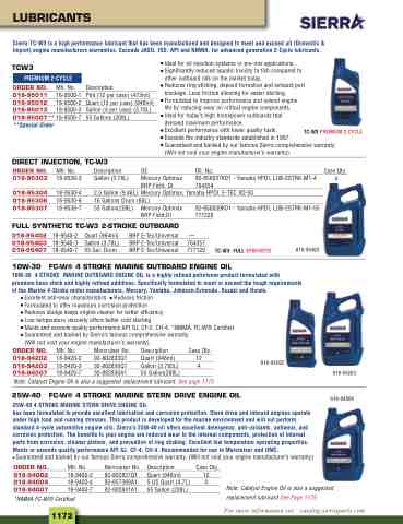 •Excellentanti-wearcharacteristics •Reducesfriction • Formulated to offer maximum corrosion protection • Reduces sludge keeps engine cleaner for better efficiency • Low temperature viscosity offers better cold starting • Meets and exceeds quality performance API SJ, CF-2, CH-4, *NMMA, FC-W® Certified • Guaranteed and backed by Sierra’s famous comprehensive warranty.