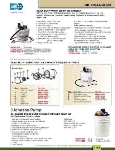 impeller pump technology • For marine or industrial applications • Serviceable & replaceable Nitrile impeller (09-843S-9) • Greater flow for faster fill, transfer, & drain • Flow reversing switch built into pump • High temperature resistant dipstick tube • Portable & convenient • Heavy-duty alligator clips easily clamp directly onto battery • Easy pour spout – No spill transfer of oil from bucket • 12 Volt • 1 Year warranty