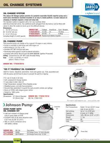 • For use on boats of all sizes • Self contained Oil Change System • 4 easy steps to fast, clean oil • High Temperature resistant Teflon Dipstick probe • Sheathed power cord with fuse protection • Secured fully assembled 14 quart(13L) pail prevents wobble and spillage • Runs on 12VDC with integral power switch • Tested for 1400 cycles. Specifications: Dimensions: 14" (34cm) Diameter ORDER NO. 17850-1012