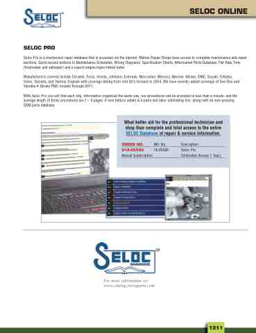 Seloc Pro is a mechanical repair database that is accessed via the internet. Marine Repair Shops have access to complete maintenance and repair sections, Quick access buttons to Maintenance Schedules, Wiring Diagrams, Specification Charts, Aftermarket Parts Database, Flat Rate Time (freshwater and saltwater) and a search engine hyper-linked index.