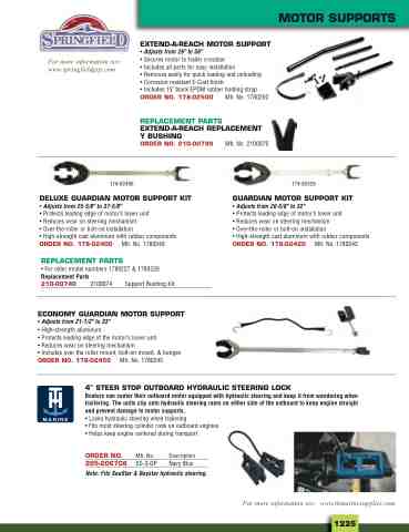 • Adjusts from 21-1/2" to 33" • High-strength aluminum • Protects leading edge of the motor’s lower unit • Reduces wear on steering mechanism • Includes over the roller mount, bolt-on mount, & bungee ORDER NO. 178-02450 Mfr. No. 1780245