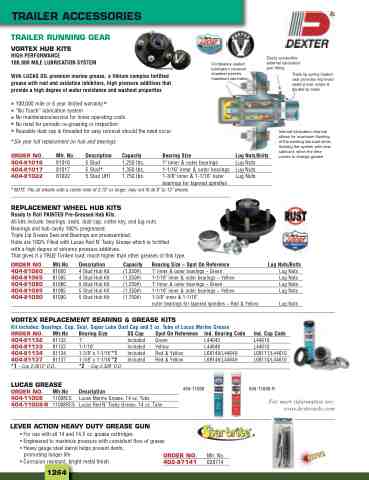 All kits include: bearings, seals, dust cap, cotter key, and lug nuts. Bearings and hub cavity 100% pregreased. Triple Lip Grease Seal and Bearings are preassembled. Hubs are 100% Filled with Lucas Red N’ Tacky Grease which is fortified with a high degree of extreme pressure additives.